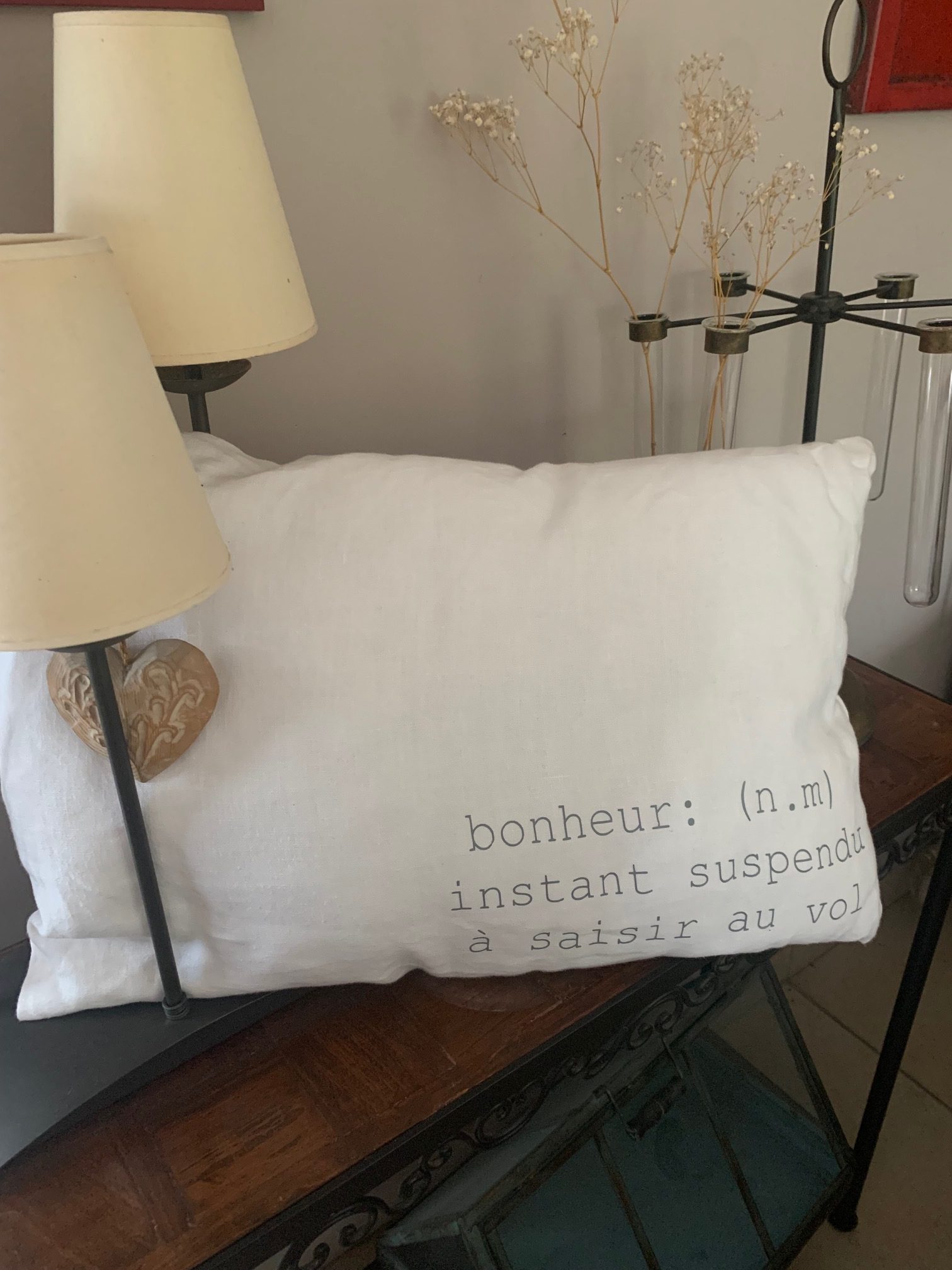 Ce coussin a été cousu dans un ancien drap; c’est pourquoi quelques petites imperfections peuvent être présentes….. ce qui en fait son charme