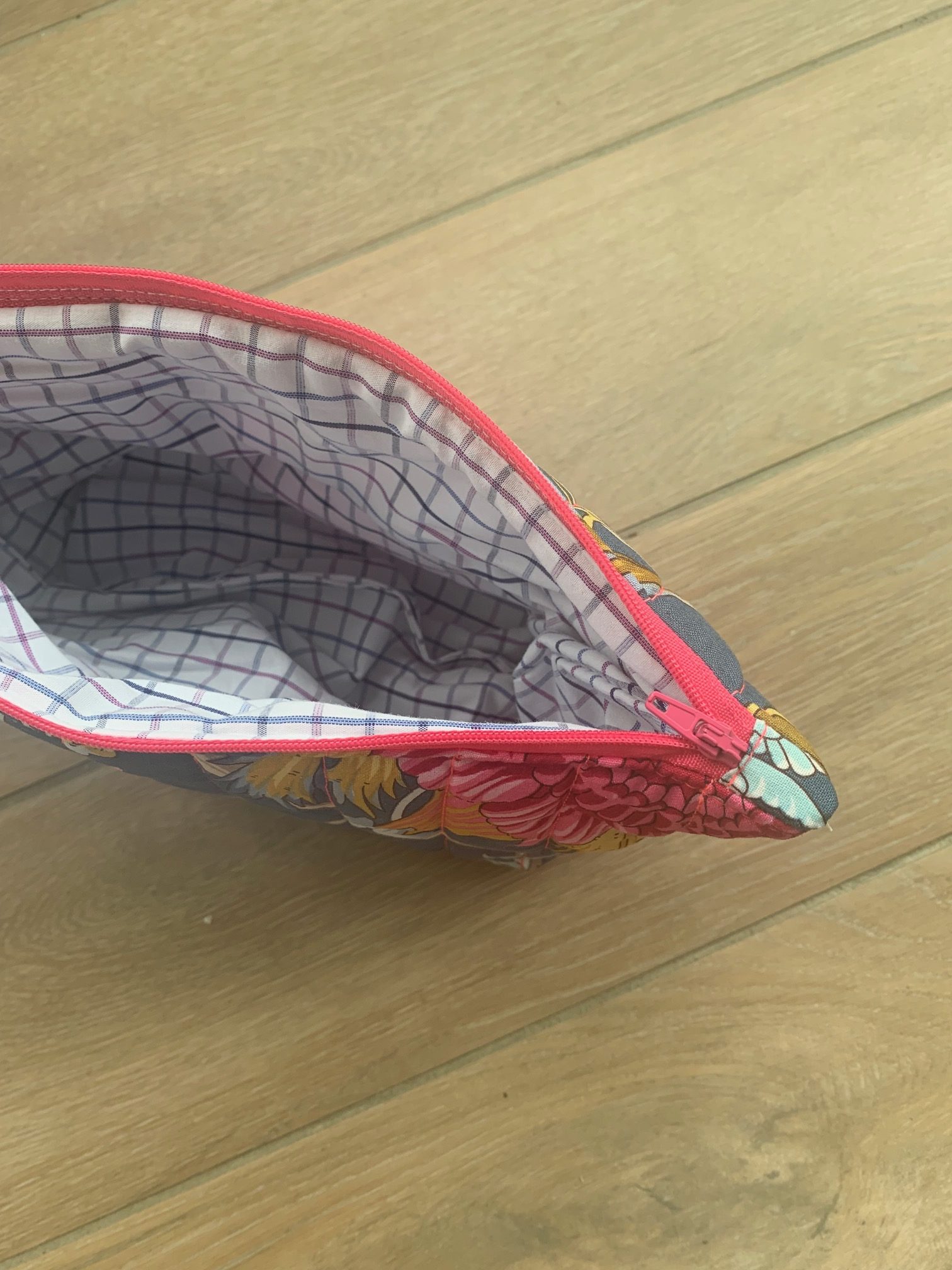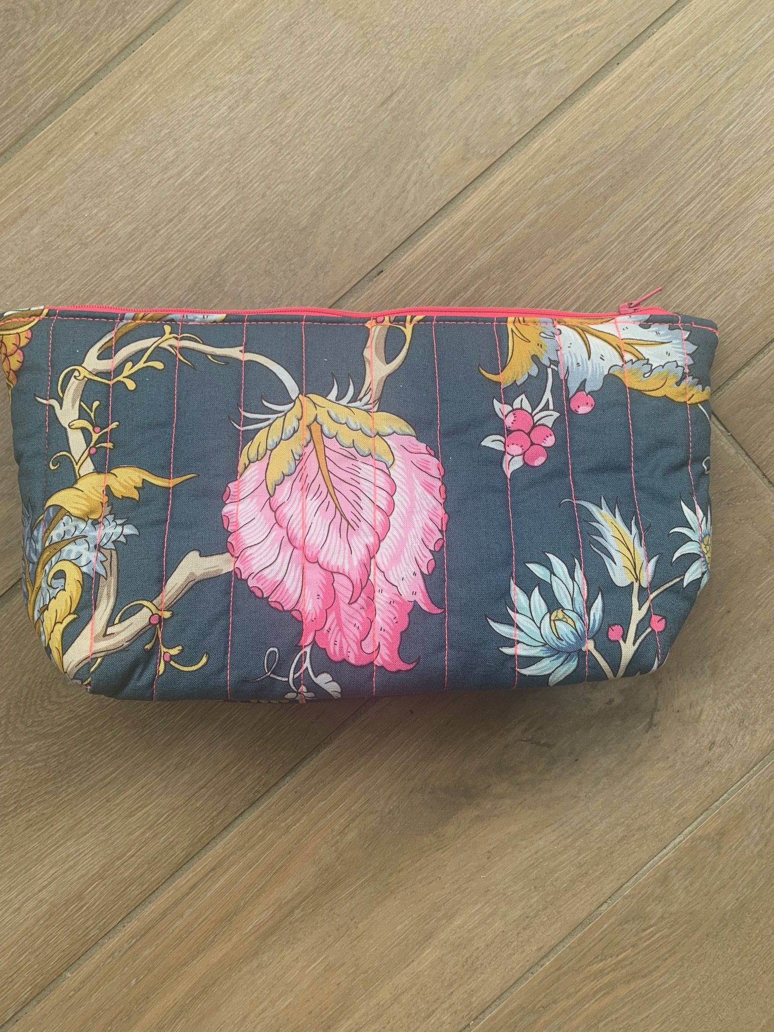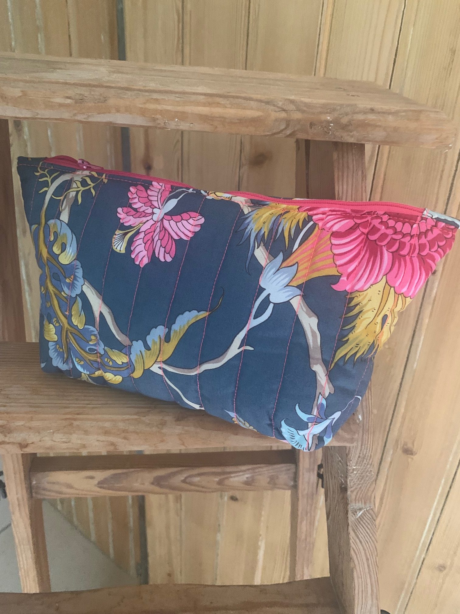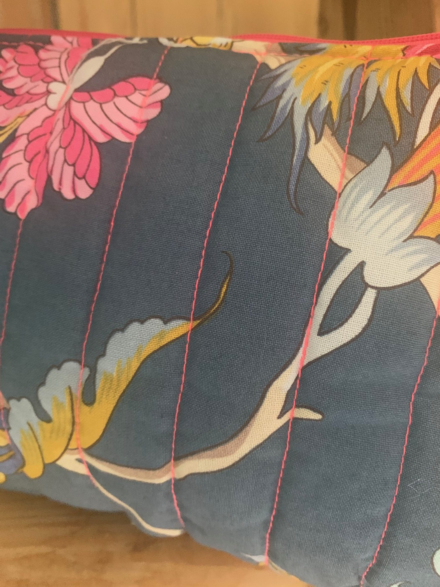 trousse en tissu jacquard multicolore fond matelassée fil fluo rose